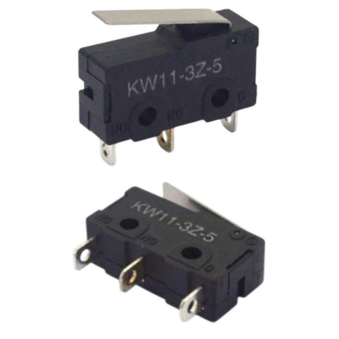 micro switch, microchave, microswitch KW11-3Z-5, chave fim de curso, chave com haste 18mm, micro switch 5A, micro switch 125V, micro switch 250V, chave com 3 terminais, sensor de limite, chave CQC, micro switch preto, chave de posição, microchave industrial, componente eletrônico, chave elétrica 5A, KW11, chave mecânica, micro switch para automação, chave com haste longa