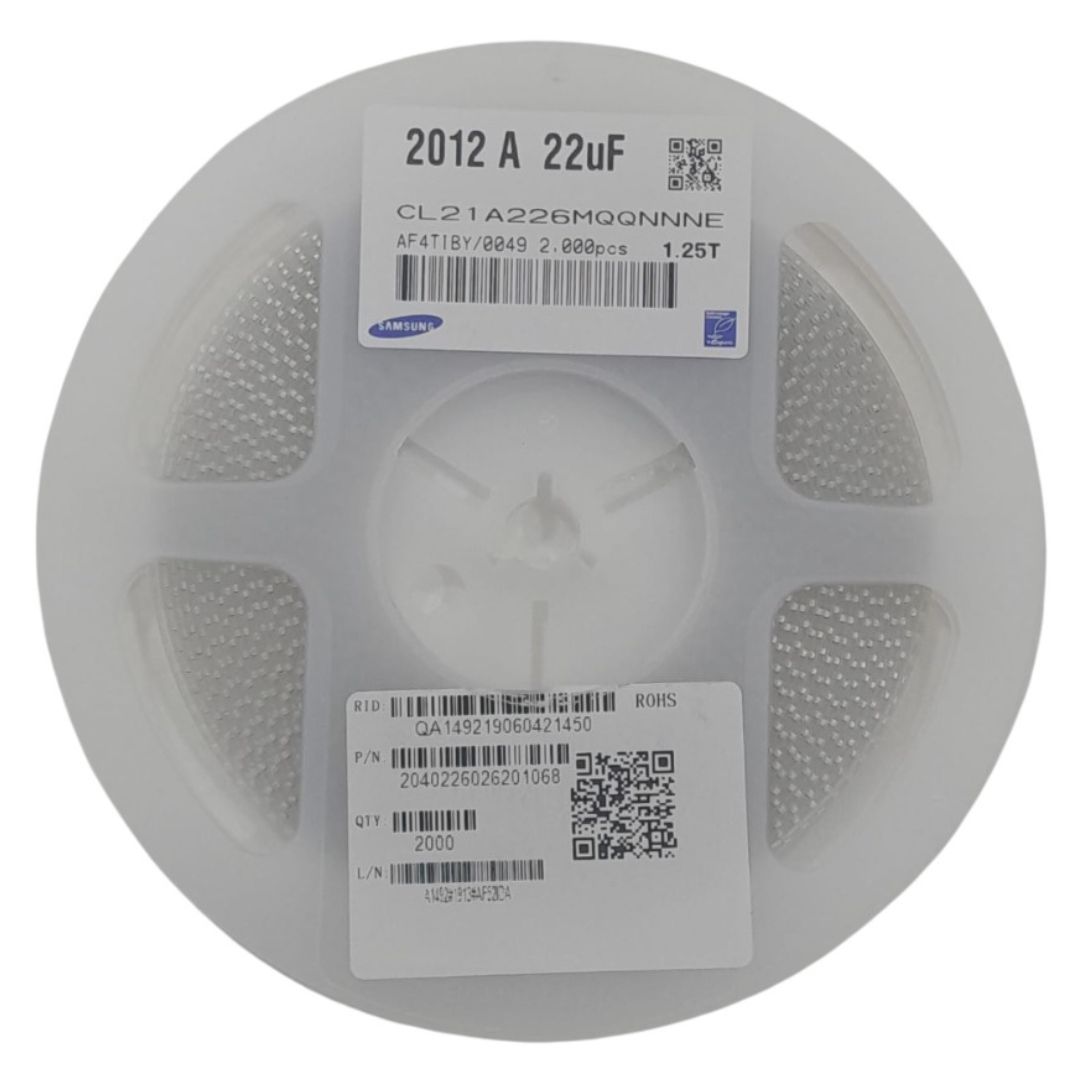 capacitor cerâmico SMD 22uF 6.3V 0805 2012 X5R, rolo 2000 peças capacitor cerâmico Samsung CL21A226MQQNNNE, capacitor SMD 22uF 6.3V, componente eletrônico confiável, montagem em superfície, filtragem e desacoplamento, circuitos digitais e analógicos, eletrônica industrial, projetos DIY eletrônicos, capacitor X5R 0805