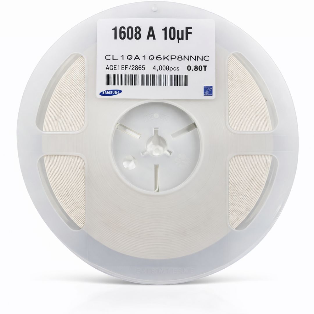 O CL10A106KP8NNNC da Samsung Electro-Mechanics é um capacitor cerâmico multicamadas (MLCC) SMD de alta confiabilidade, desenvolvido para aplicações eletrônicas que exigem boa estabilidade, alta densidade de montagem e excelente desempenho em placas PCB. Possui capacitância de 10µF, tensão nominal de 10V e tolerância ±10%, utilizando dielétrico X5R, que oferece boa estabilidade térmica e ótima relação entre capacitância e tamanho do componente.