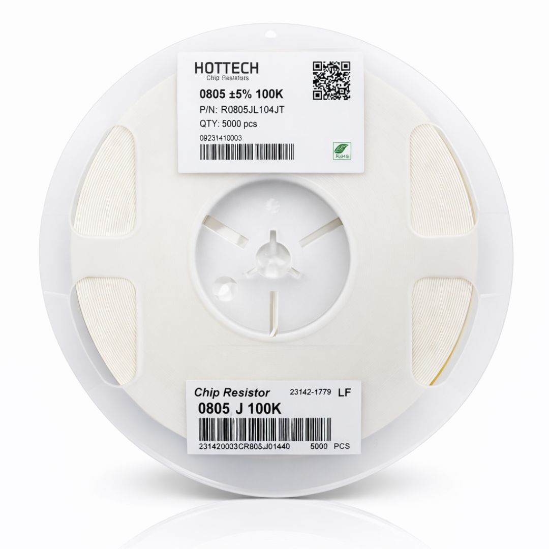 Resistor SMD 100KΩ 0805 1/8W 5% Hottech (RI0805L104JT) em rolo com 5.000 peças. Tecnologia thick film, alta estabilidade e confiabilidade, ideal para montagem SMT em placas PCB e aplicações eletrônicas em geral.