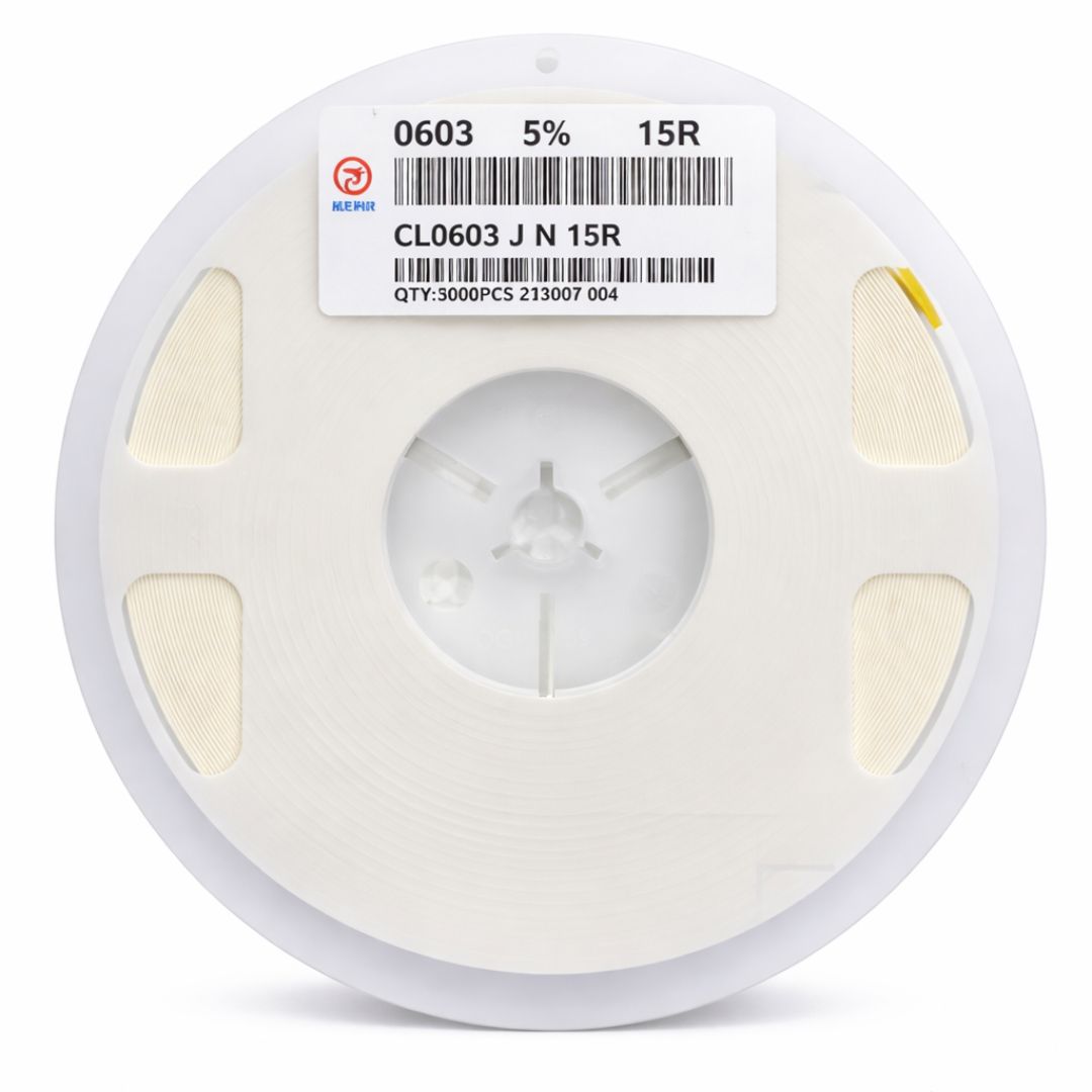 O CL0603 J N 15R da Yageo é um resistor SMD de 15 ohms (15R) no encapsulamento 0603 (1608 métrico), com potência nominal de 1/10W (0,1W) e tolerância de ±5%.