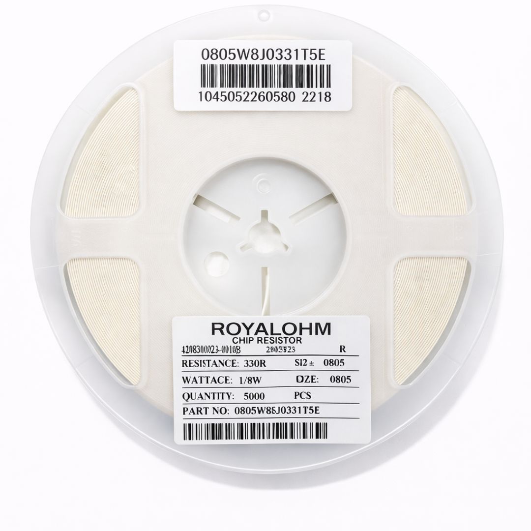 Resistor SMD 330Ω 0805 1/8W 5% Royalohm (0805W8J0331T5E) em rolo com 5.000 peças. Tecnologia thick film, alta confiabilidade e estabilidade térmica, ideal para montagem SMT em PCB e aplicações eletrônicas em geral.