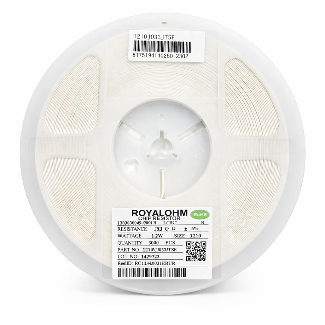 O 1210W2J033JT5E da Royalohm é um resistor SMD de 3,3 ohms (3R3 / 3.3Ω) no encapsulamento 1210 (3225 métrico), com potência nominal de 1/2W (0,5W) e tolerância de ±5%.