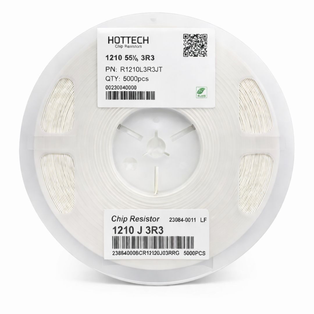 O Resistor SMD 3R3 (3.3Ω) 1210 Hottech modelo RI1210L3R3JT possui potência de 1/2W (0,5W) e tolerância de ±5%, ideal para aplicações que exigem maior dissipação térmica e robustez elétrica.